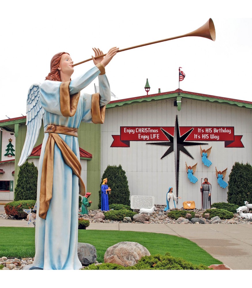 9' Larger Than Life Size Trumpeting Angel - Available in Yellow or White - Fiberglass figure is expertly cast and hand painted - Perfect for indoor or outdoor use - USA Made